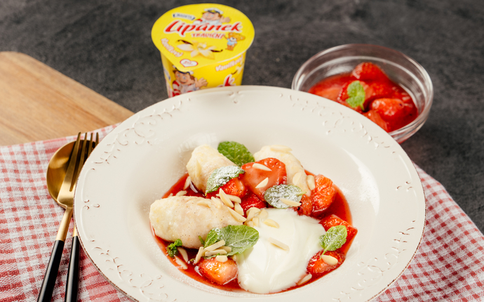 Do mísy dáme Jihočeské žervé, žloutek, cukr, sůl, mleté mandle a vše promícháme. Poté přidáme mouku a vypracujeme těsto. Rozdělíme ho na čtyři díly a z každého vyválíme váleček, který krájíme na kousky široké zhruba 2,5 cm. Z každého kousku tvarujeme nok. Vodu v hrnci přivedeme k varu a noky vaříme ve vroucí vodě 1–2 minuty. Jahody omyjeme, osušíme a pokrájíme na půlky či čtvrtky podle velikosti jahod. Pokrájené jahody vložíme do rendlíku, přidáme vanilkový cukr, med a šťávu z citronu. Přivedeme k varu a vaříme do změknutí jahod. Noky podáváme s omáčkou z jahod a lžíci tvarohového Lipánka.