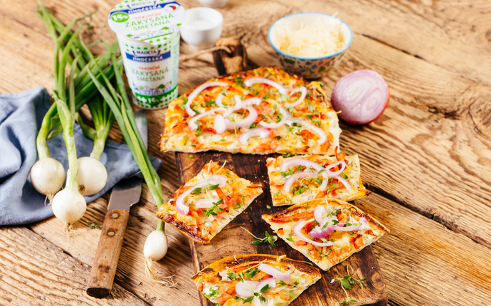 Tarte Flambeé s červenou cibulí, slaninou a Jihočeskou zakysanou smetanou