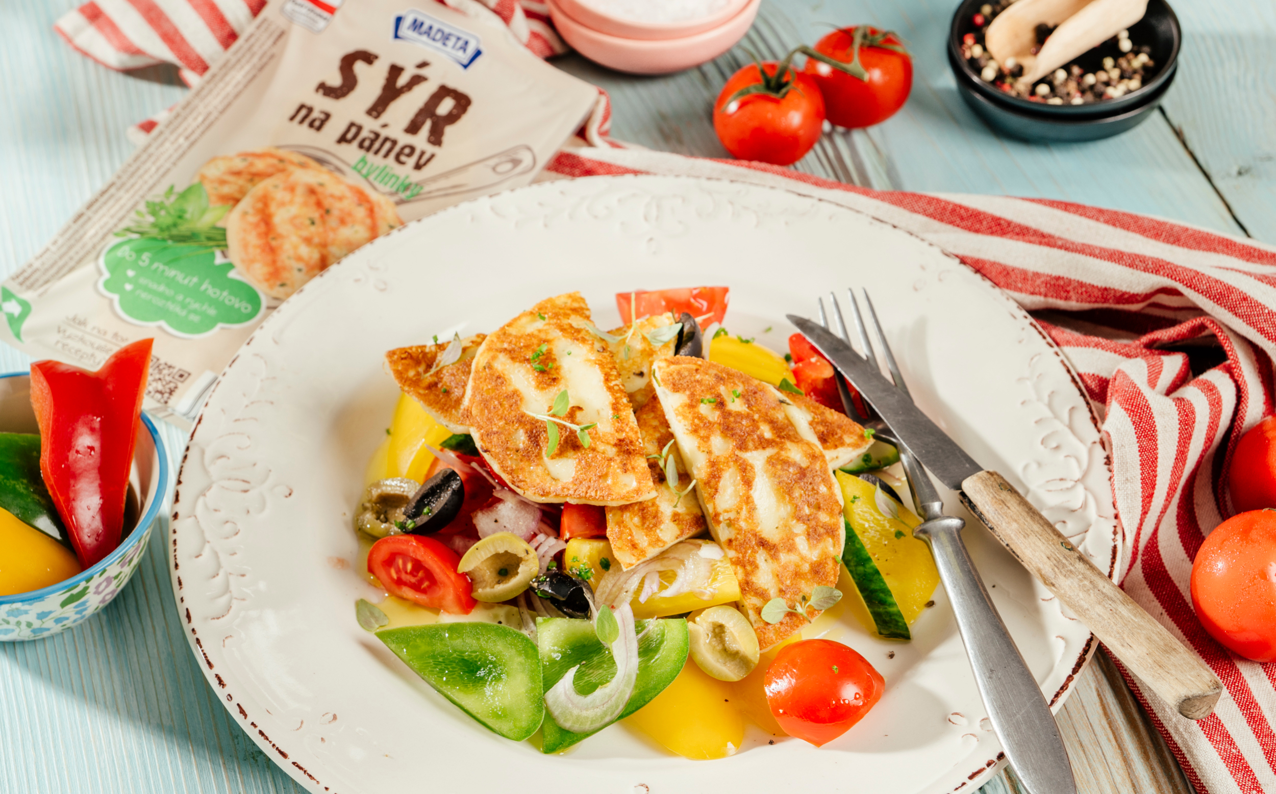 Okurku a rajčata nakrájíme na větší kusy. Cibuli na měsíčky, papriku na proužky a olivy na půlky. Všechnu zeleninu smícháme v míse a zakápneme olivovým olejem, vinným octem a osolíme. Sýr na pánev opečeme na suché pánvi z obou stran dozlatova a podáváme společně se salátem.