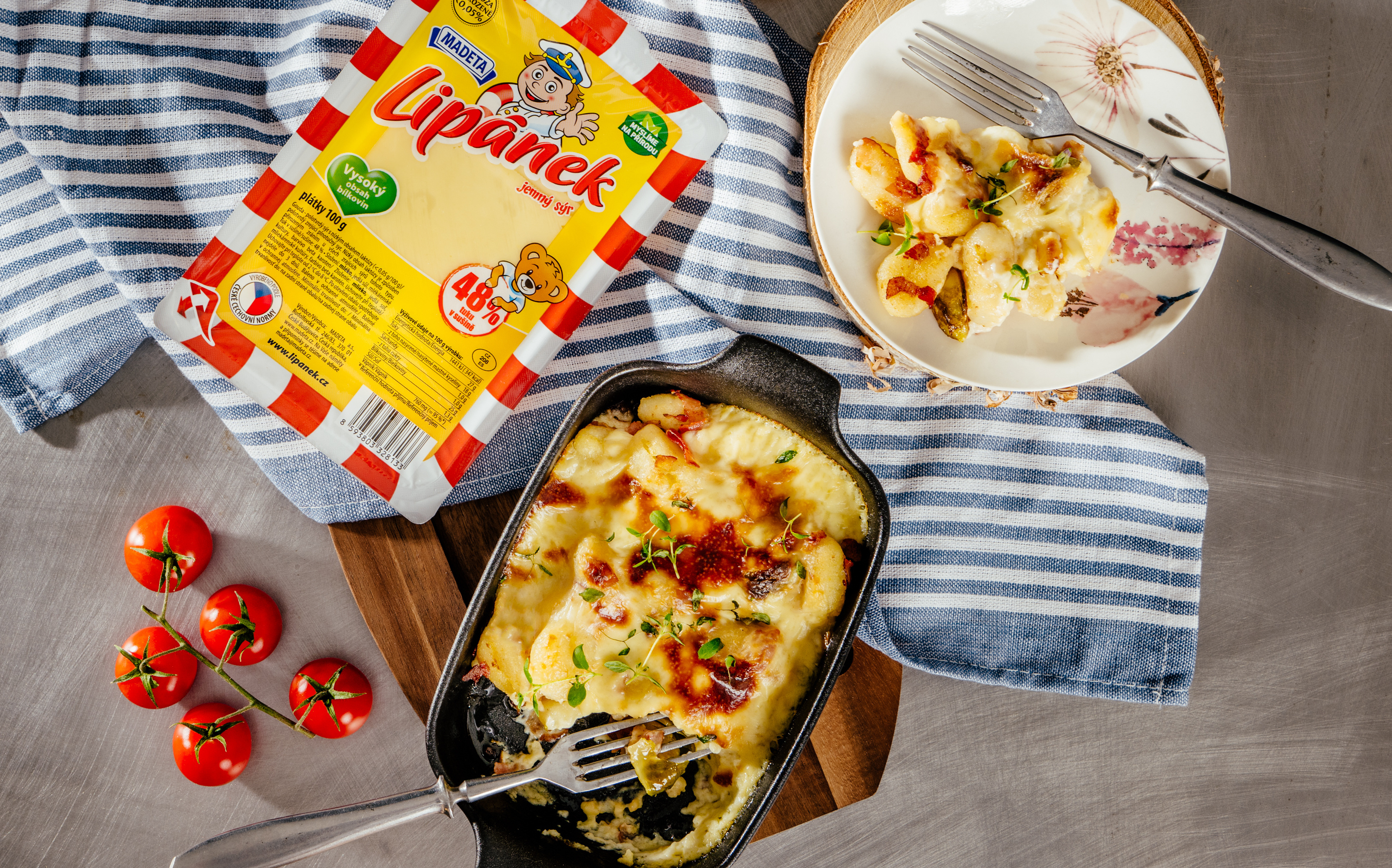 Gnocchi uvaříme dle návodu. Slaninu a kapustu si nakrájíme nadrobno. V hrnci rozehřejeme Jihočeské máslo a hladkou mouku a umícháme v jíšku. Poté přidáme mléko, sůl, pepř, muškátový oříšek a jedno balení sýru Lipánek. Mícháme do zhoustnutí. Na pánvi s olivovým olejem opečeme slaninu a kapustu, osolíme a opepříme. Uvařené gnocchi smícháme se slaninou a kapustou. Přendáme do zapékací mísy, zalijeme sýrovou omáčkou a navrch položíme zbylé plátky sýru Lipánek. Pečeme v předehřáté troubě při 180 °C dozlatova.