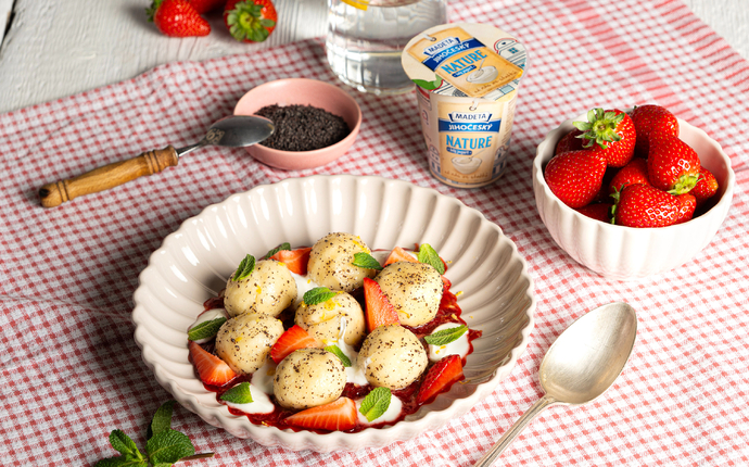 Sladké knedlíčky z Jihočeského Nature bílého jogurtu s jahodami a mákem