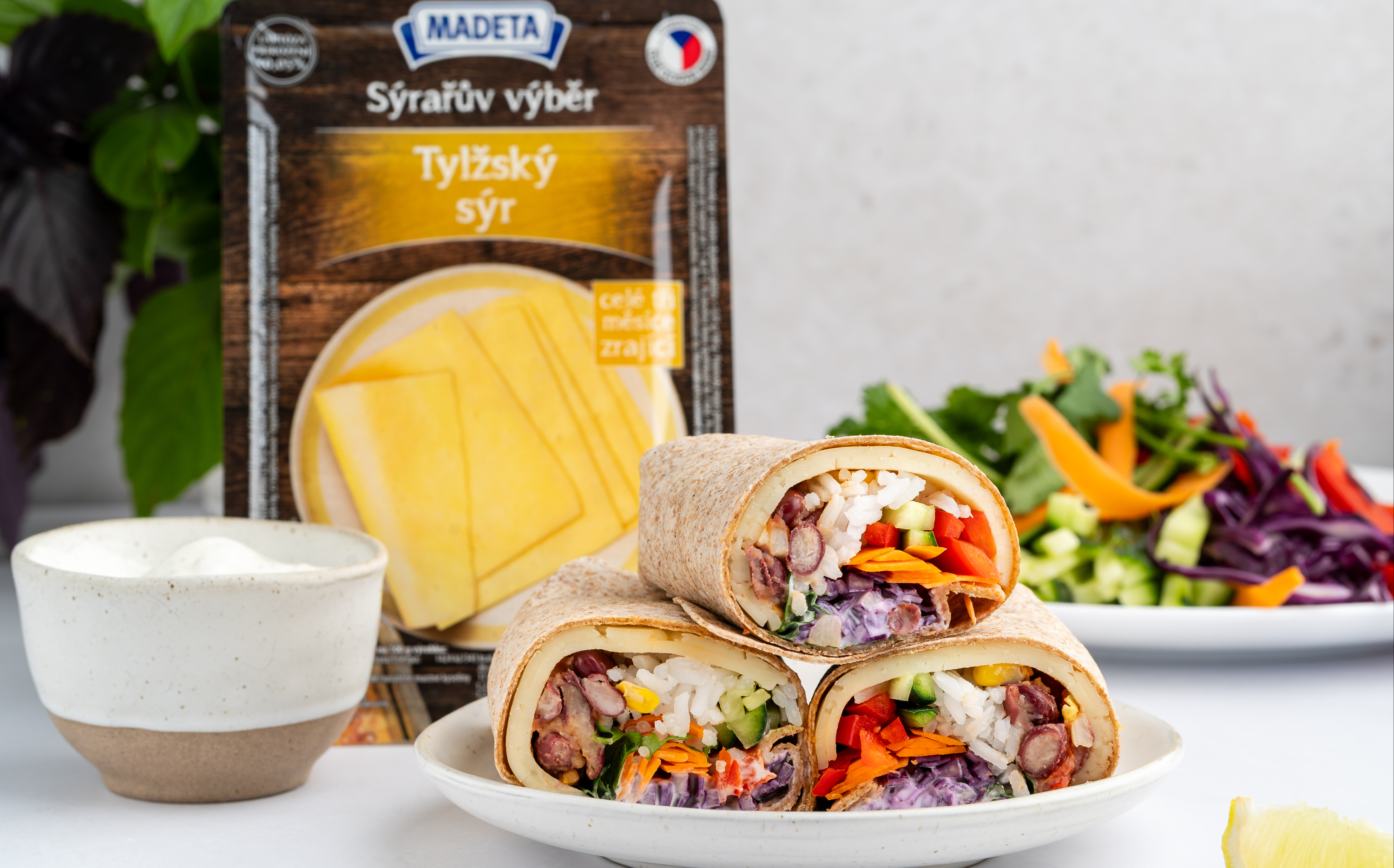 Tortilly si krátce nahřejeme na suché pánvi. Na každou tortillu rozložíme dva plátky Tylžského sýra, část uvařené rýže, navrstvíme směs fazolí s rajčaty a kukuřicí, přidáme nakrájenou čerstvou zeleninu – okurku, mrkev, červené zelí a koriandr. Nakonec přidáme dip ze zakysané smetany.