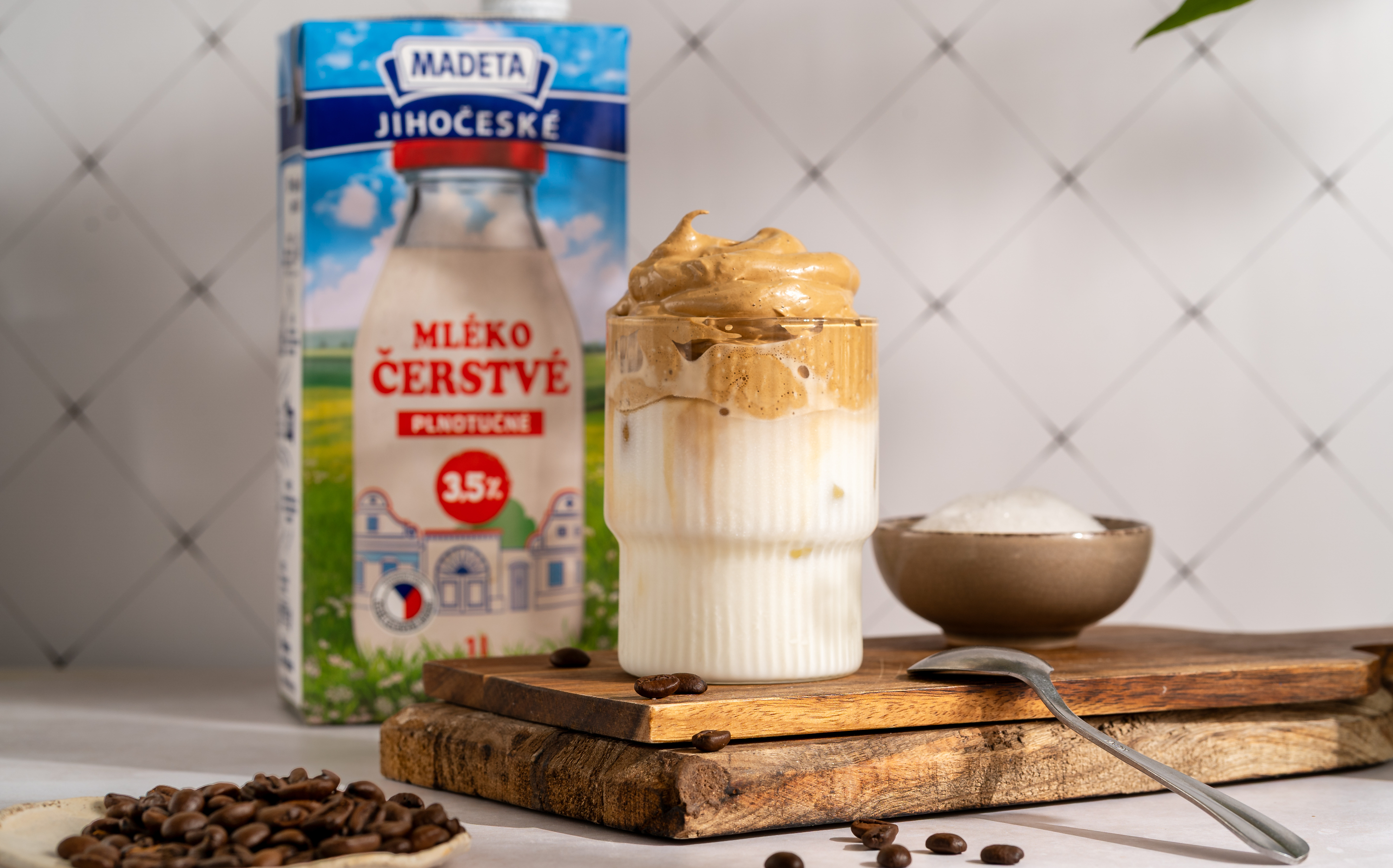 Do sklenice nasypeme pár kostek ledu, které zalijeme čerstvým studeným mlékem do dvou třetin sklenice. Nahoru navrstvíme připravenou kávovou pěnu a můžeme podávat.
