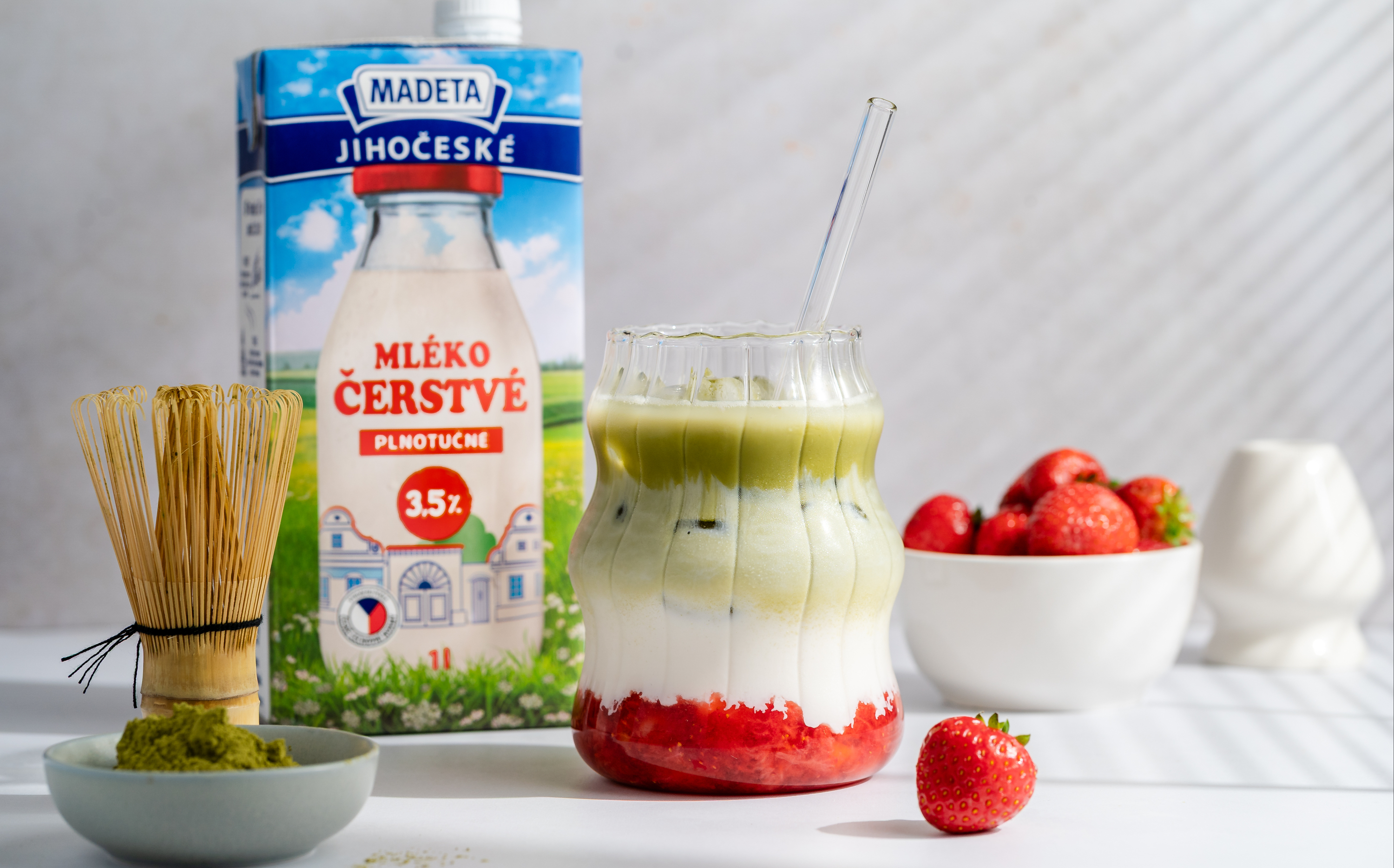 Matchu rozmícháme v horké vodě (70–80 °C) metličkou nebo malým šlehačem tak, aby se vytvořila jemná pěna bez hrudek. Do sklenice s jahodami a ledem nalijeme vychlazené mléko, a nakonec pomalu přilijeme připravenou matchu.