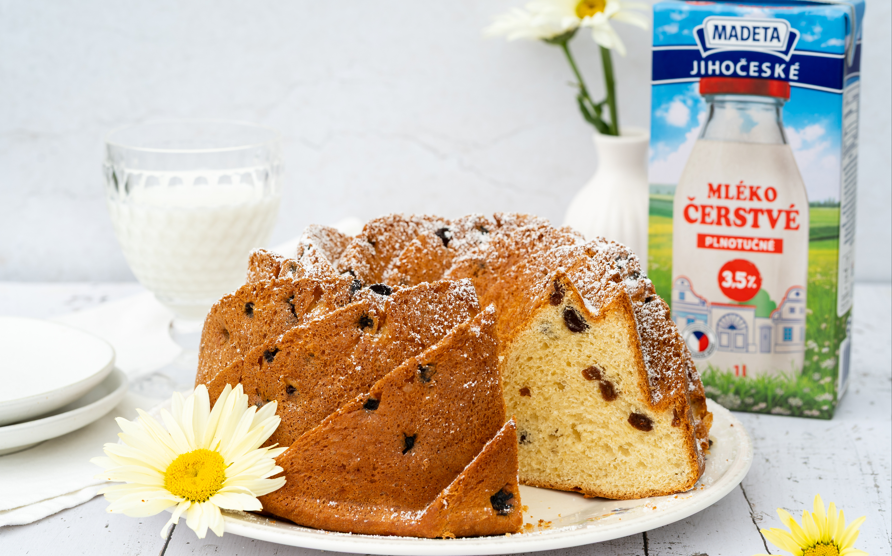 Do mléka dáme droždí, přidáme 200 g mouky, rozmícháme na hladké těstíčko a to necháme dobře přikryté 1 hod. kynout při pokojové teplotě. Poté přidáme ostatní zbylé ingredience – kromě rozinek – a stěrkou nebo vařechou vymícháme do hladkého těsta. Úplně na závěr zamícháme rozinky. Těsto ihned dáme do máslem dobře vymazané bábovkové formy, přikryjeme utěrkou a necháme nakynout do dvojnásobného objemu. Pečeme v rozehřáté troubě při 160–165 °C zhruba 30–35 minut, nebo dokud špejle nezůstane úplně suchá. Bábovku vyklopíme z formy ještě vlažnou, pocukrujeme a podáváme.