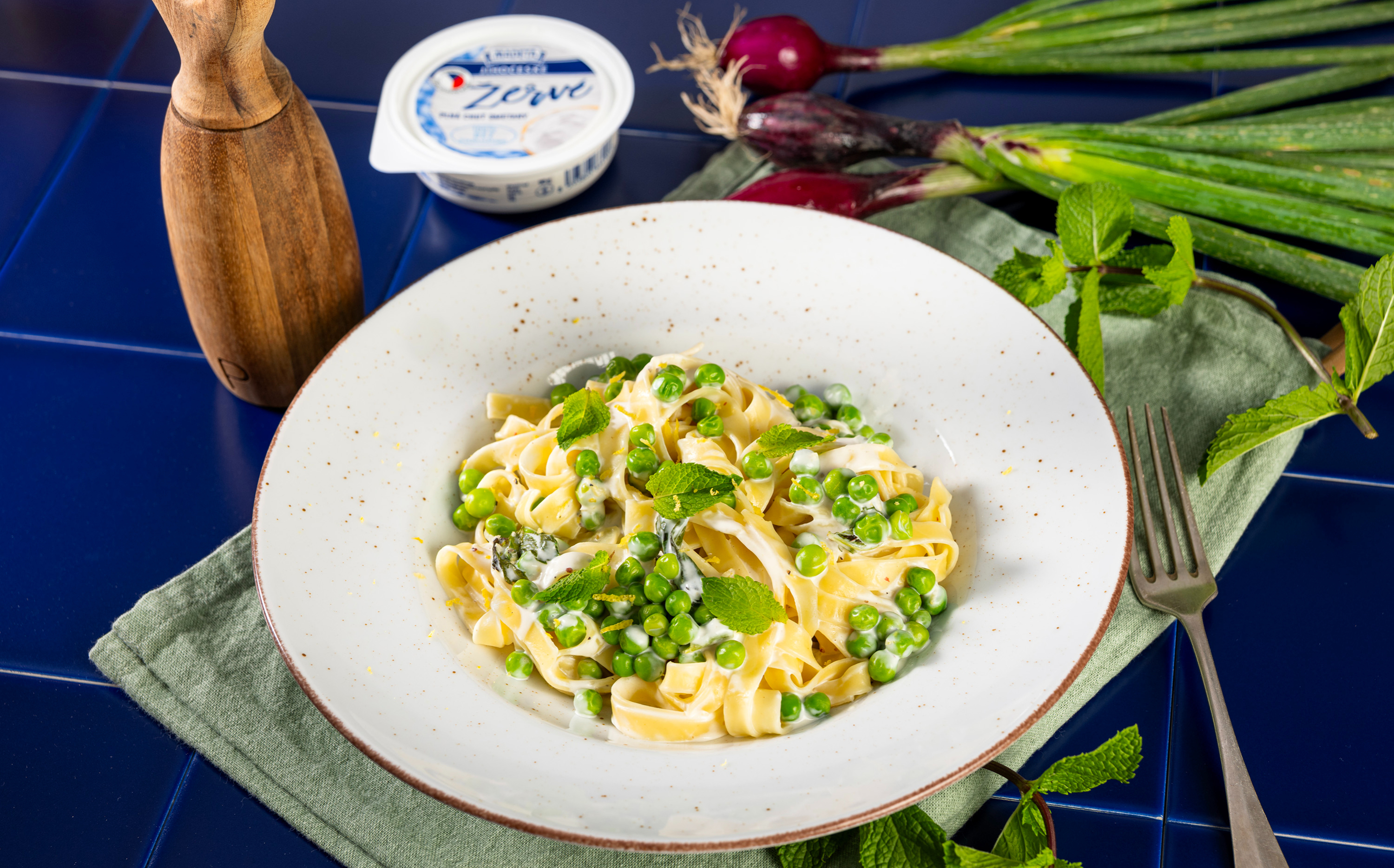 Těstoviny s Jihočeským žervé, citronem, zeleným hráškem a mátou