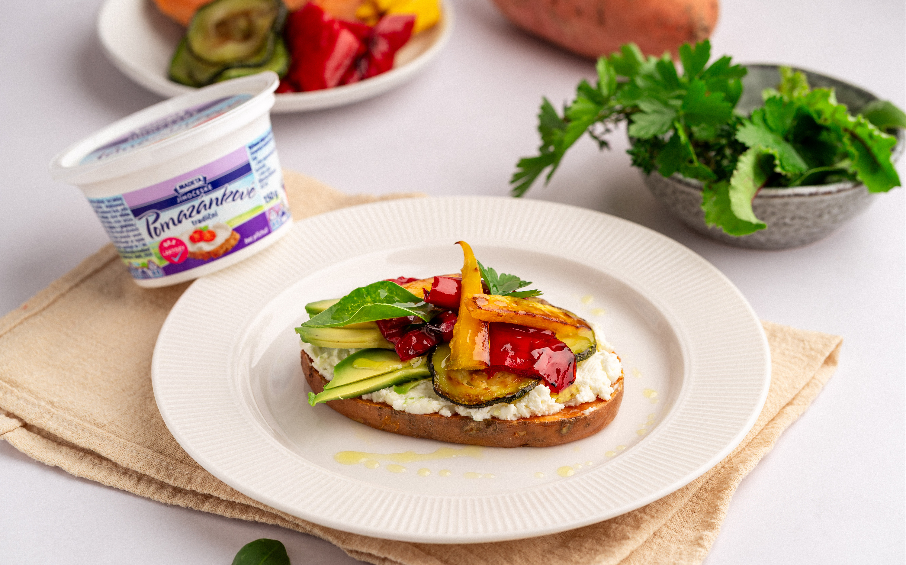 Upečené plátky batátu potřeme Jihočeským pomazánkovým tradičním bez laktózy. Nahoru položíme plátky avokáda a na závěr přidáme pečenou zeleninu.