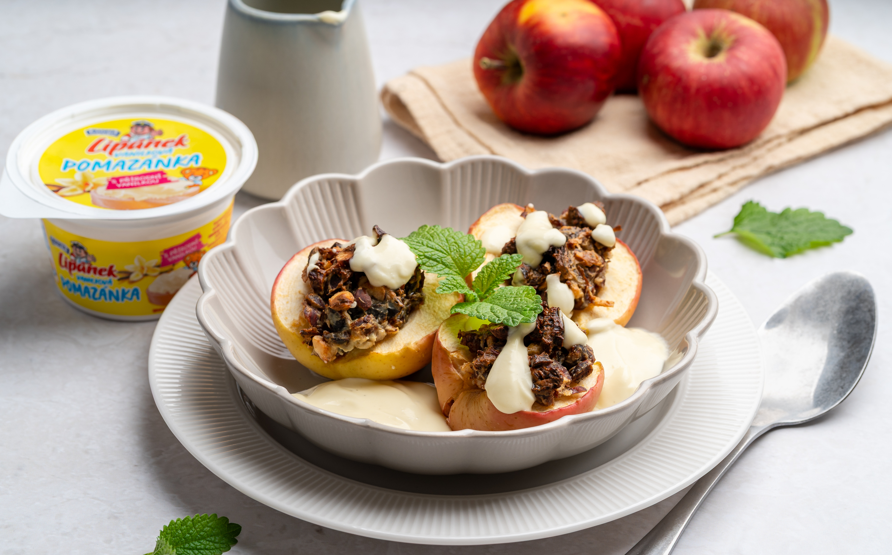 Datle a ořechy nasekáme najemno. Smícháme je s vanilkovou pomazánkou Lipánek, skořicí a kardamomem. Vzniklou směsí naplníme jablka a vyskládáme je do menší zapékací misky.