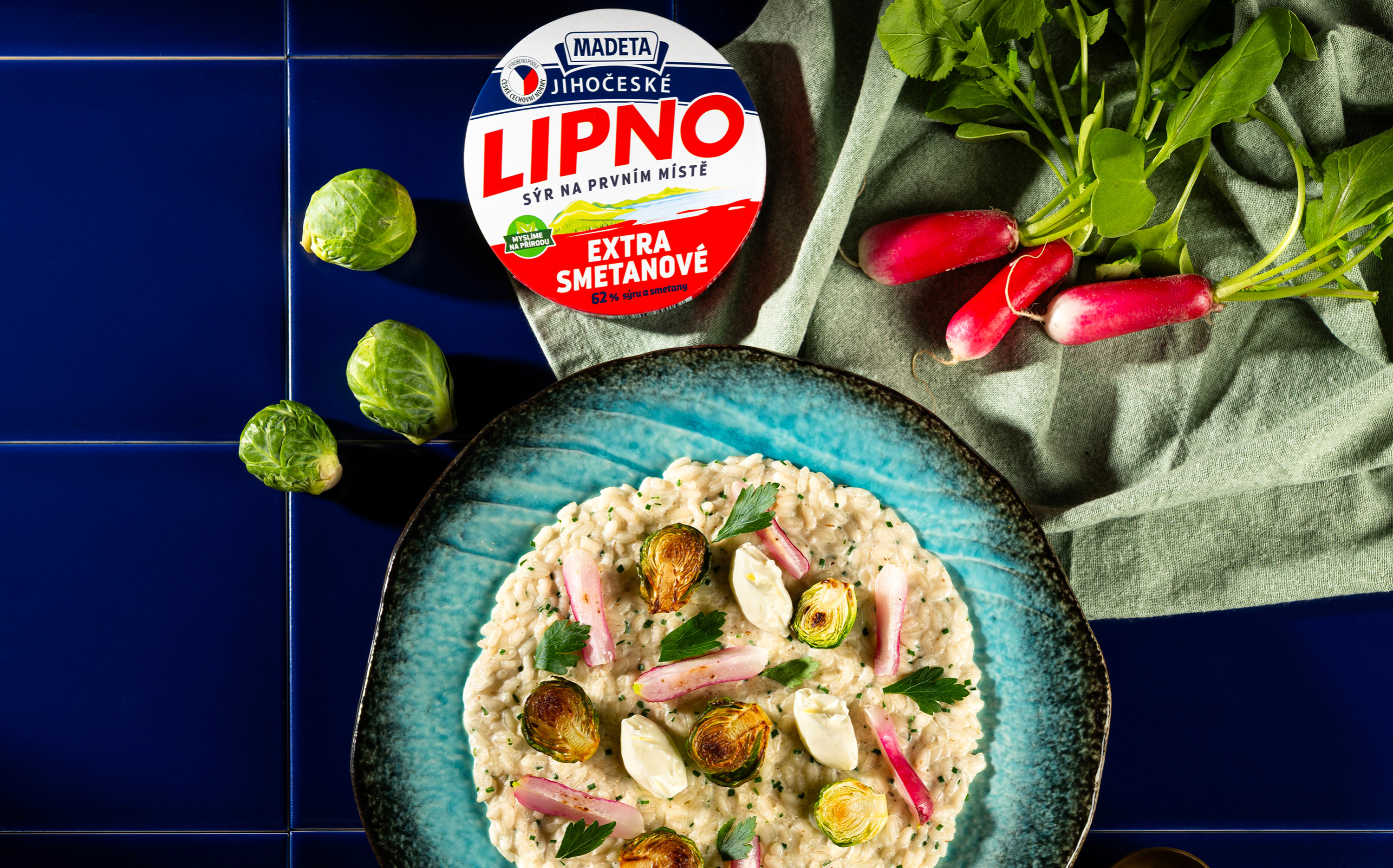 Růžičkovou kapustu blanšírujeme ve vroucí osolené vodě asi 3 minuty a poté ji zchladíme v ledové vodě. Rozpůlíme ji, ředkvičky nakrájíme na čtvrtky a oboje orestujeme na olivovém oleji a kousku Jihočeského másla dozlatova. V hrnci rozehřejeme zbytek Jihočeského másla s olivovým olejem, přidáme nadrobno nakrájenou cibuli a necháme ji zesklovatět. Přisypeme rýži, lehce ji orestujeme, zalijeme vínem a necháme odpařit alkohol. Poté postupně přiléváme horký vývar, vždy jen trochu, a mícháme, dokud se tekutina nevstřebá. Tento proces opakujeme, dokud není rýže krémová a uvařená. Vmícháme sýr Lipno, dochutíme solí a pepřem. Rizoto ozdobíme opečenou zeleninou a na závěr posypeme jemně nastrouhanou citronovou kůrou.