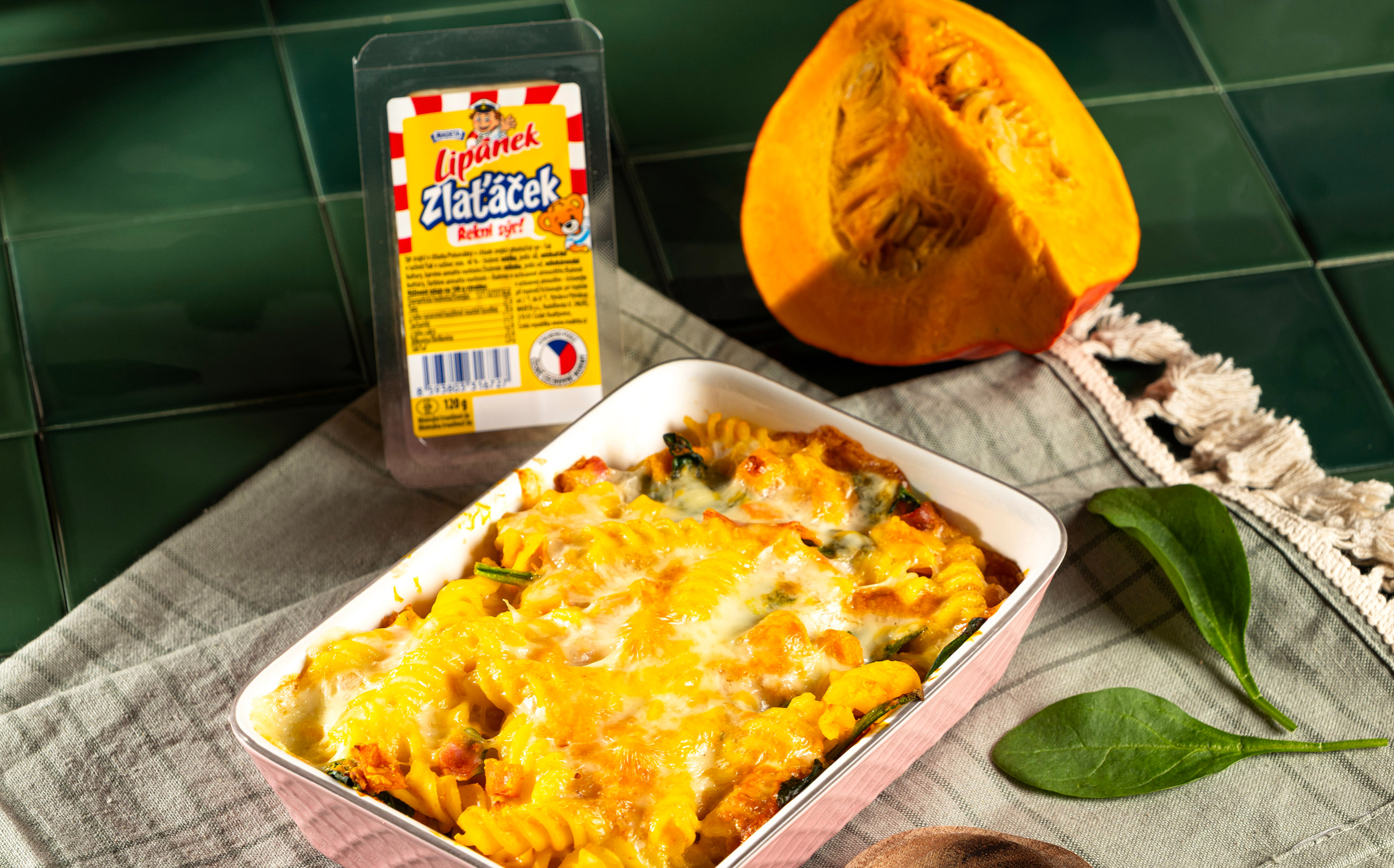 Zapečené těstoviny s dýní, Lipánkem Zlatáčkem, šunkou, špenátem a krémovou dýňovou omáčkou