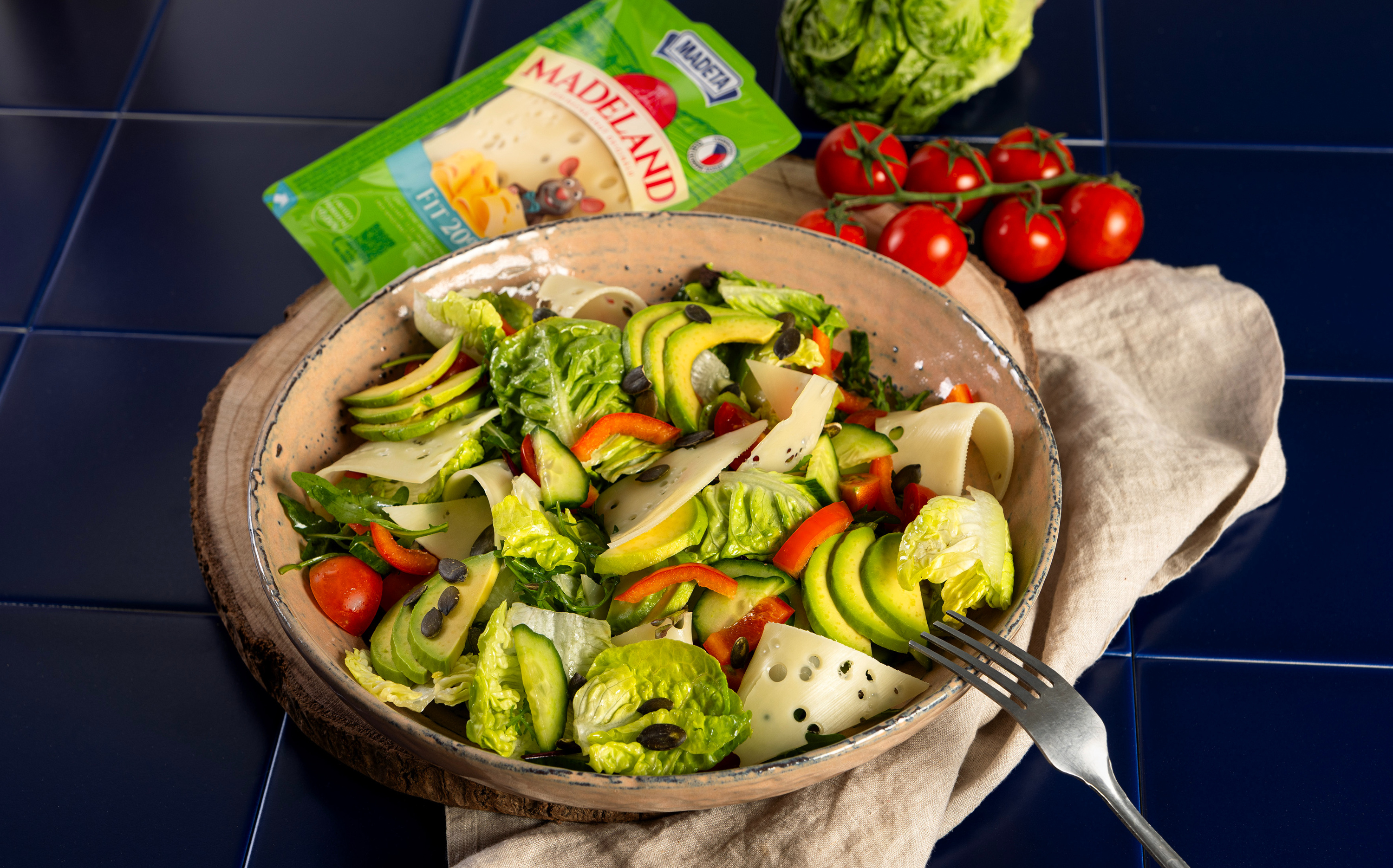 Zeleninu omyjeme a nakrájíme na kousky. Přidáme kostky sýru Madeland Fit a semínka. V misce smícháme olej, citronovou šťávu, sůl a pepř. Zálivku promícháme se salátem těsně před podáváním.