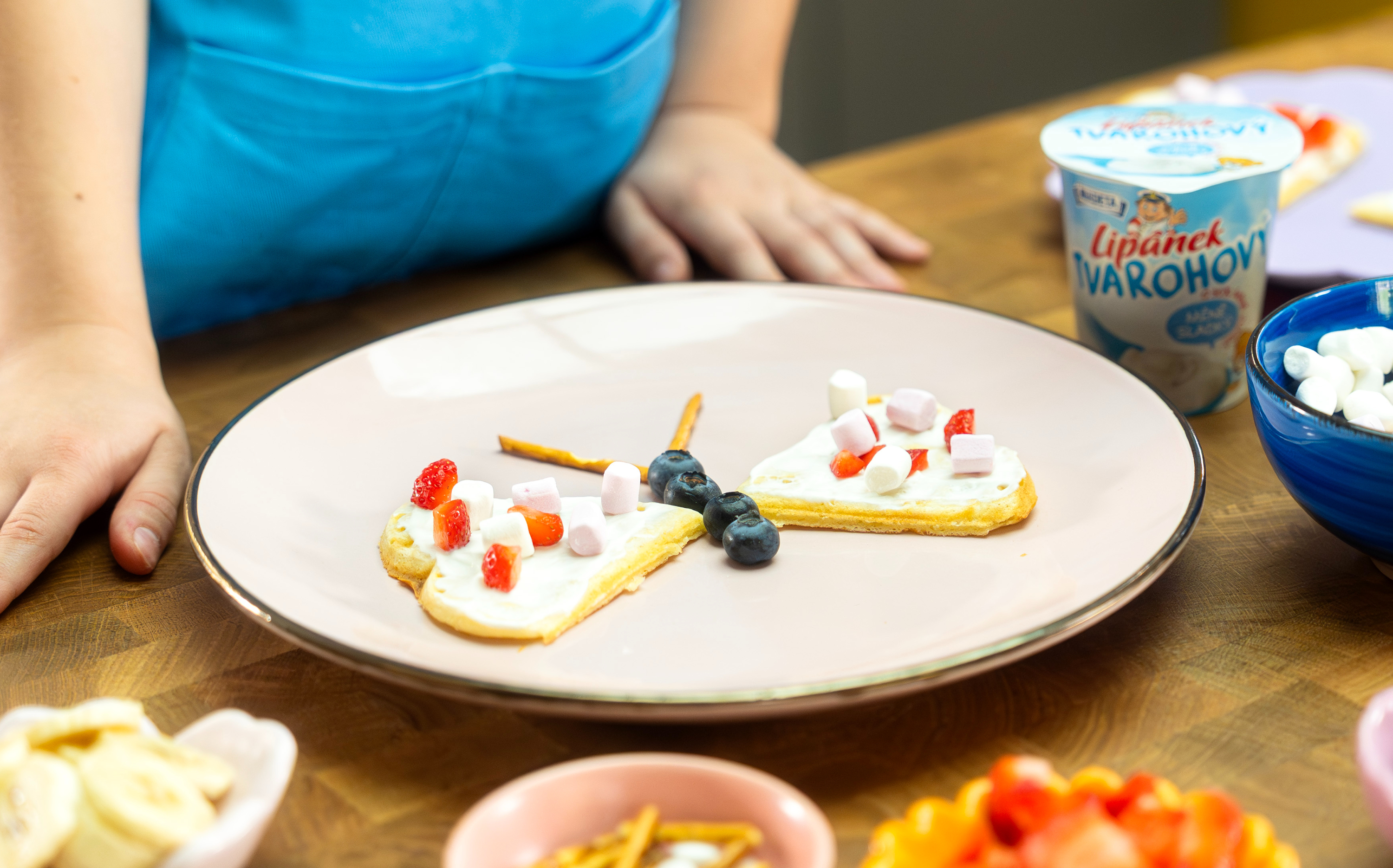 V míse smíchej obě mouky, cukr, prášek do pečiva, špetku soli, čerstvé Jihočeské mléko smíchané s vejcem a rozpuštěné Jihočeské máslo. Hotové těsto nalij do rozehřátého vaflovače a peč dozlatova. Hotové vafle potři tvarohovým Lipánkem a ozdob třeba jako motýlka nebo legrační obličej. Na tykadla použij slané tyčinky, borůvky jako tělíčko a křídla posyp jahodami a marshmallow.