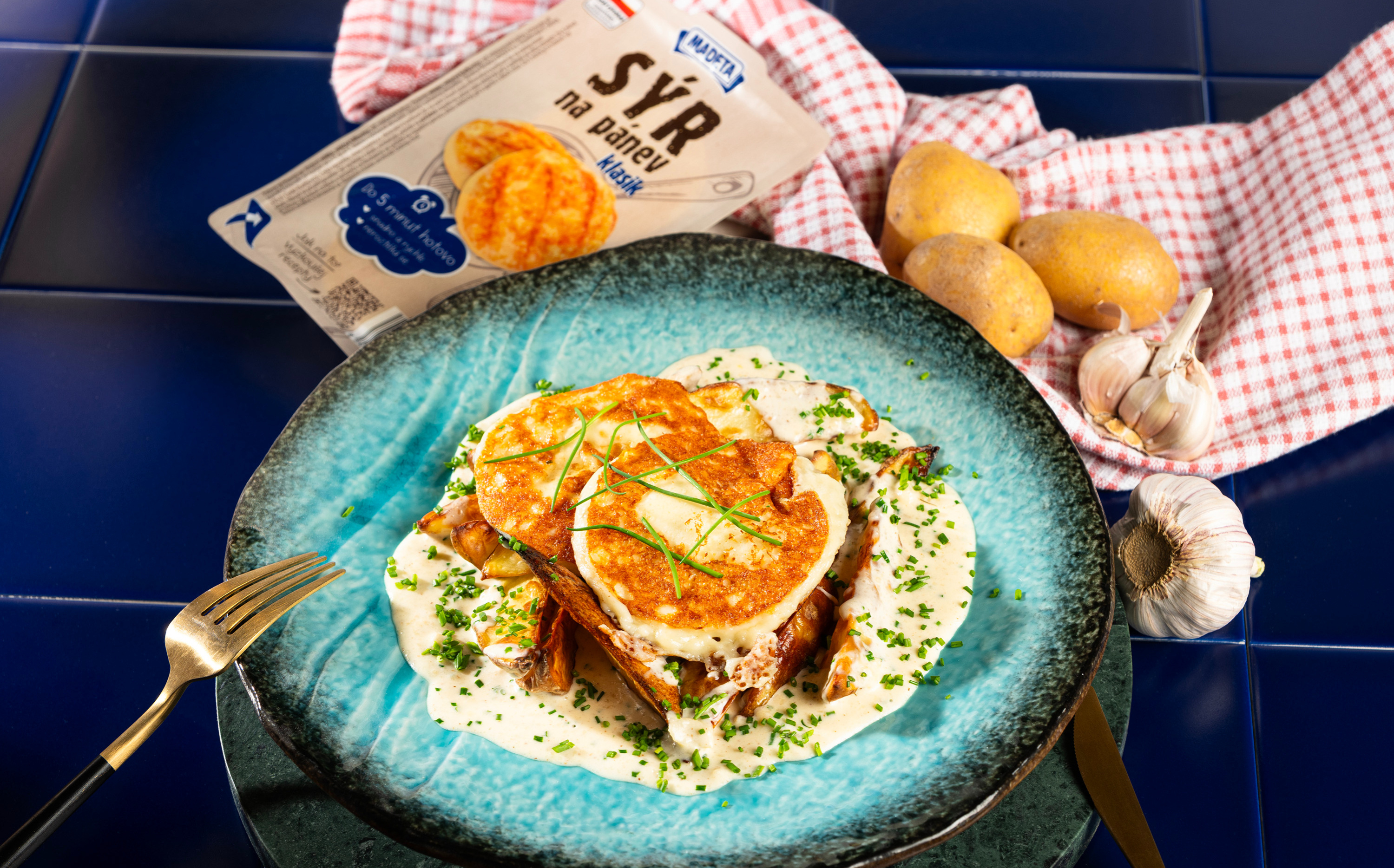 Sýr na pánev s krémovou česnekovou omáčkou a bramborovými měsíčky