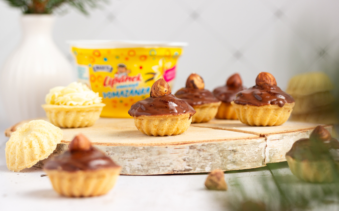 Košíčky vyklopíme a necháme vychladnúť. Vanilkovú nátierku Lipánek dáme do cukrárskeho vrecka a košíčky ju naplníme. Čokoládu necháme veľmi pozvoľne rozpustiť vo vodnom kúpeli s maslom. Vrch košíčkov namočíme v čokoláde a ozdobíme lieskovým orieškom.
